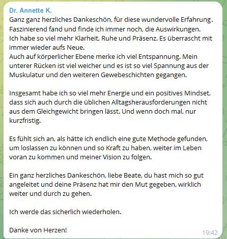 Die Verbindung von Körper und Emotionen hält den Schlüssel zu mehr Business-Power. Beate Nimsky zeigt dir in nur einer Woche, wie du mit den Geheimnissen aus der chinesischen Medizin deine Energiequellen freilegst und emotionale Blockaden löst – für 20% mehr Leistung in nur 6 Tagen!